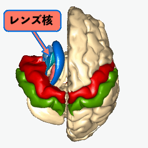 視床の外側の位置に、視床の方にレンズを向けているような形をして存在しているのが『大脳基底核・レンズ核』で、皮質下ネットワークのなかで、出力系の働きをしています。