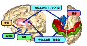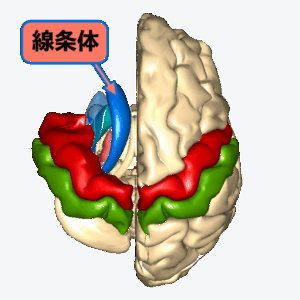 視床の内側に、長くぐるっと尻尾を巻いた様な形をしているのが『大脳基底核・線条体』です。